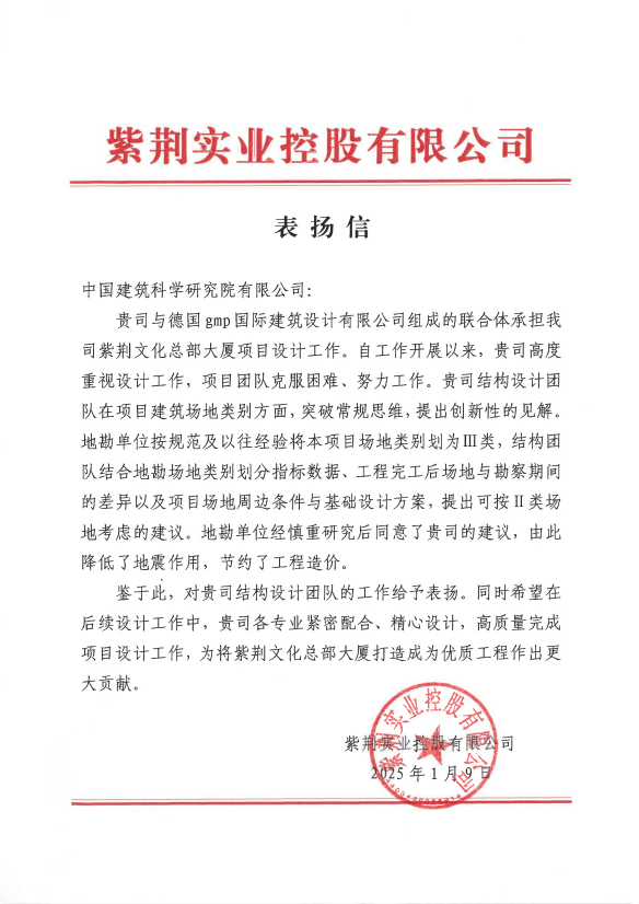 1月9日,中國建研院深圳分公司收到紫荊實業(yè)控股有限公司發(fā)來的表揚信,對中國建研院深圳分公司紫荊文化總部大廈項目設(shè)計團隊的工作給予充分肯定。