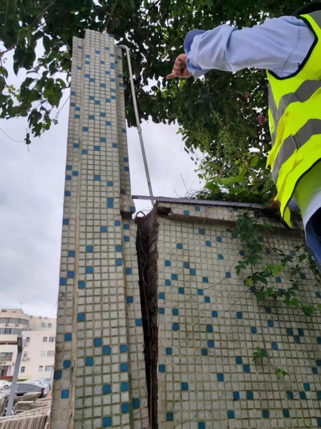 某河道上蓋房屋出現地面下陷,房屋墻體開裂等情況,技術人員第一時間趕赴居民家中,針對查勘發現的問題,當即建議主管部門對危險區域進行清空圍擋,拉設警戒區域,樹立警戒標識,避免造成更大險情。同日,某幼兒園內的原塊石擋土墻上部的磚砌擋土墻出現變形開裂,技術人員第一時間與主管部門、幼兒園一起對該擋土墻進行安全排查,針對查勘發現的問題,當即建議在坡頂設立警戒區域并停止使用,并建議坡底應采取措施可靠的安全措施,防止對人員造成傷害。技術人員同步將情況反饋給公司技術專家組,為相關部門后續開展解危整治工作提供科學決策依據和專業技術意見。