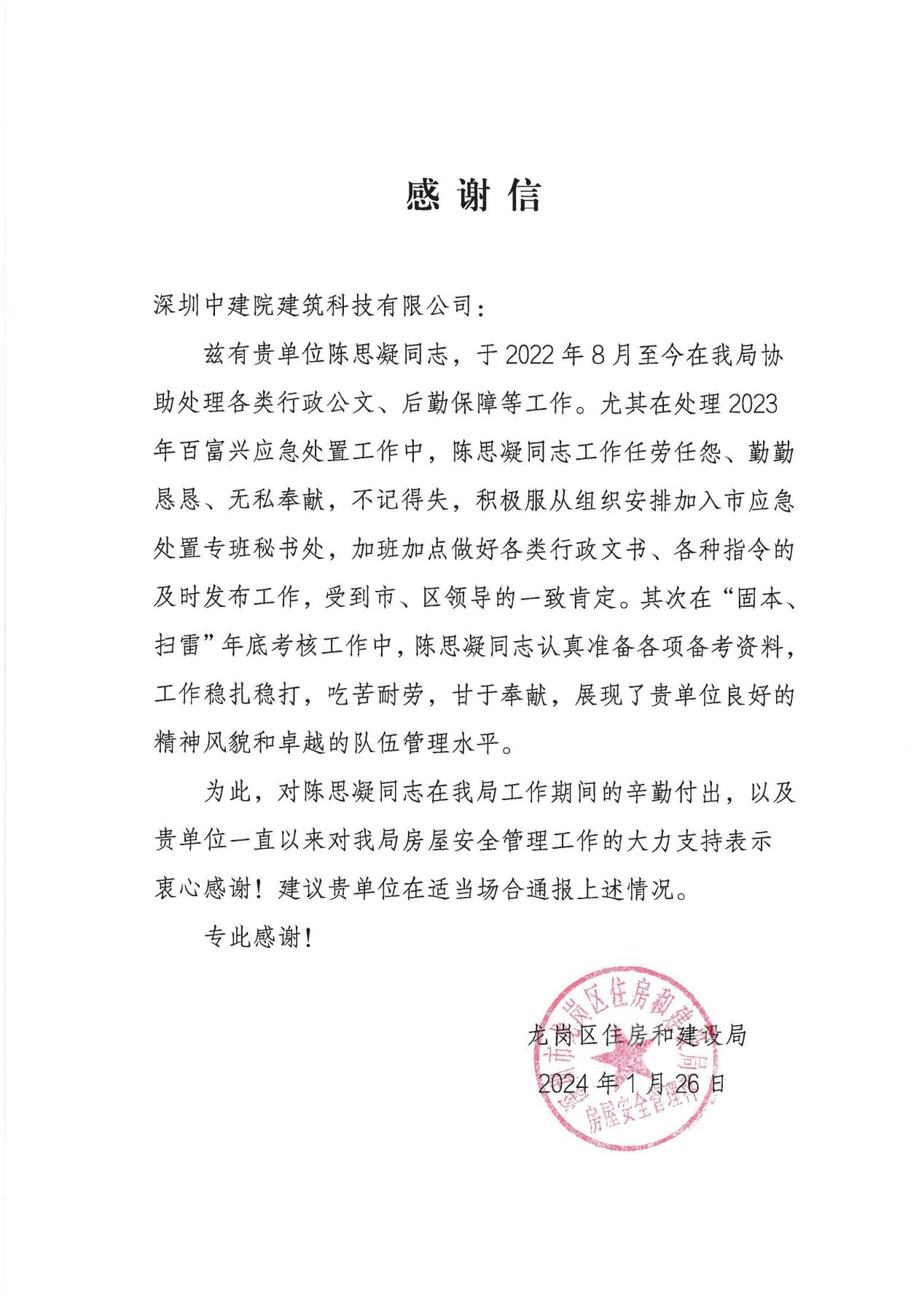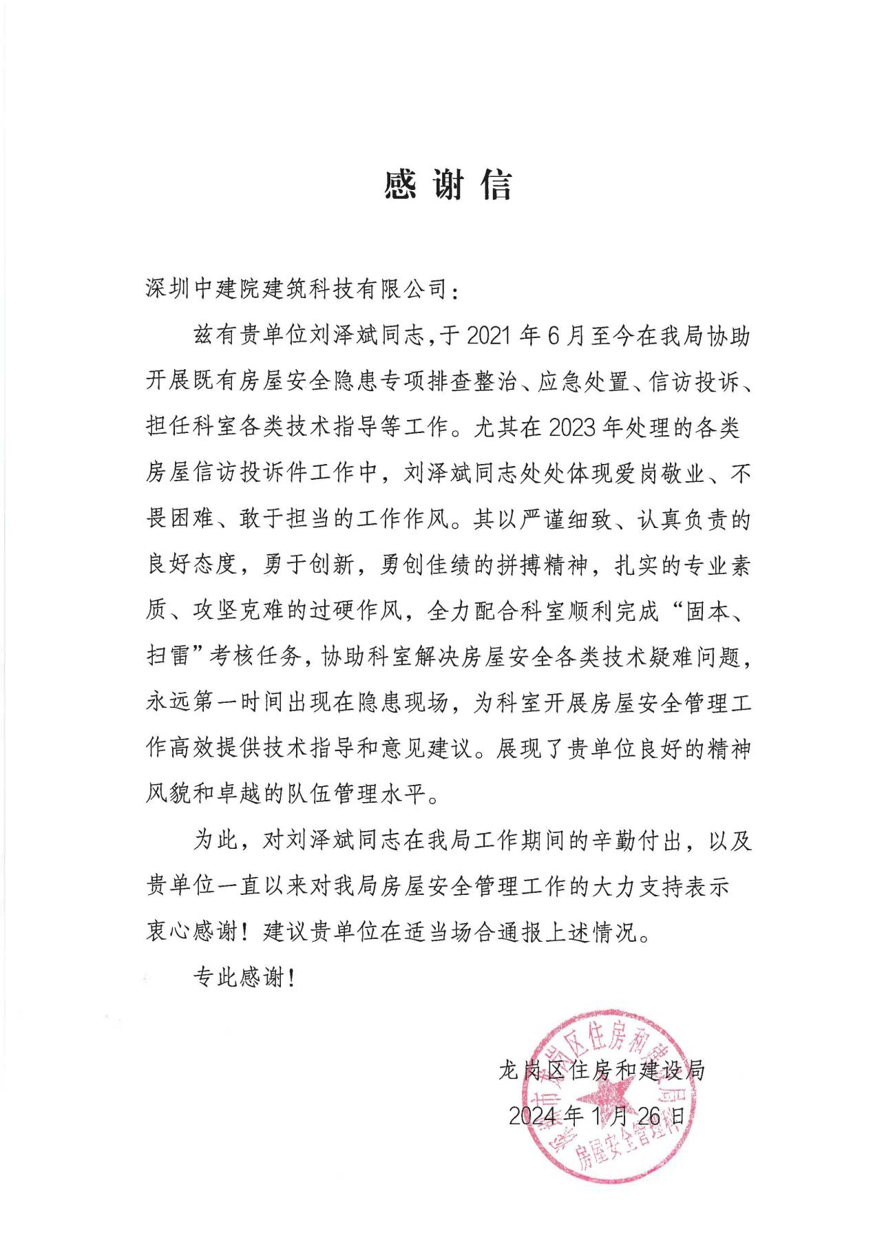 近期,深圳中建院建筑科技有限公司(以下簡(jiǎn)稱“深圳中建院”)收到深圳市龍崗區(qū)住房和建設(shè)局發(fā)來(lái)的感謝信,對(duì)深圳中建院多年來(lái)在房屋安全管理工作中的大力支持表示感謝,對(duì)劉澤斌、陳思凝兩位同志的辛勤付出提出表?yè)P(yáng)。