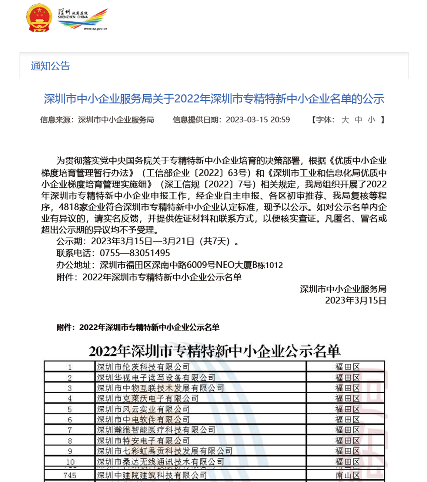 3月15日-21日,深圳市中小企業服務局對2022年深圳市專精特新中小企業名單進行公示,深圳中建院建筑科技有限公司(簡稱“深圳中建院”)獲得深圳市專精特新中小企業認定。