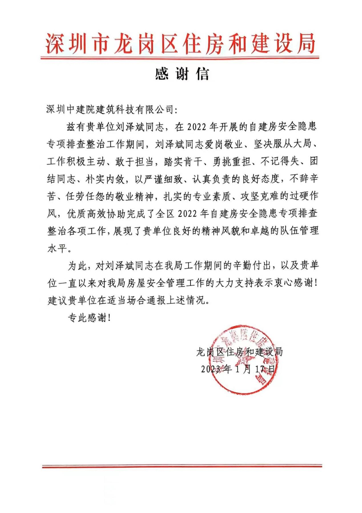 近期,深圳中建院建筑科技有限公司(以下簡(jiǎn)稱“深圳中建院”)收到深圳市龍崗區(qū)住房和建設(shè)局發(fā)來的感謝信,對(duì)深圳中建院及劉澤斌同志在2022年度開展的自建房安全隱患專項(xiàng)排查整治工作中的辛勤付出和大力支持表示誠(chéng)摯的謝意。