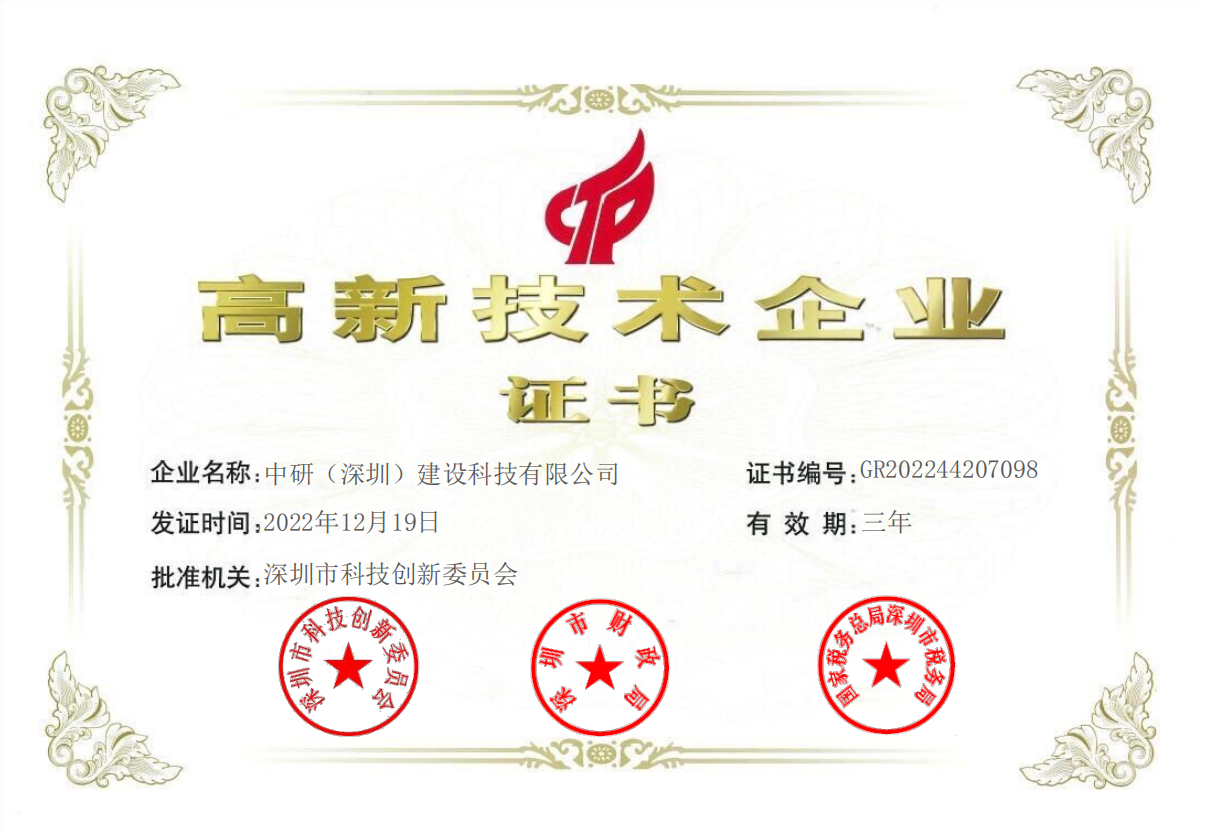 日前,中研(深圳)建設科技有限公司(下稱中研科技)順利通過評審,獲得了國家高新技術企業認定證書(證書編號:GR202244207098),由此正式邁入國家高新技術企業行列,開啟新篇章。