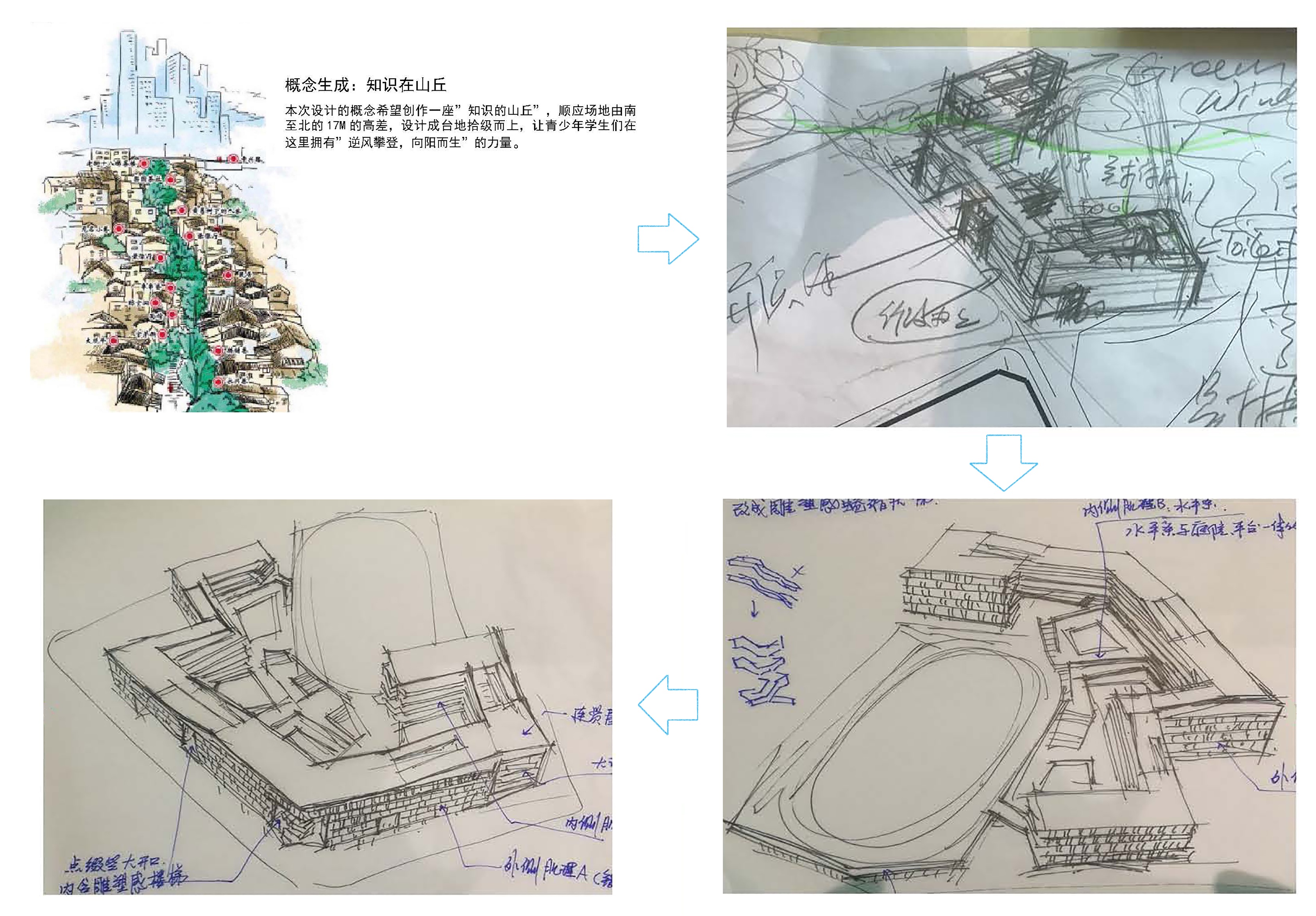 “書山有路勤為徑,學海無涯苦作舟”,求學之路道阻且難,每一位學子都須要傾其十余年心血,方能在學業上有所小成。我司深圳龍勝學校建筑方案以“知識的山丘”設計概念,將求學的攀登之路與項目的地形地貌相結合,為學校創作了一個寓理于景的立體式校園設計方案,以期展現莘莘學子勤勉求學的畫卷。